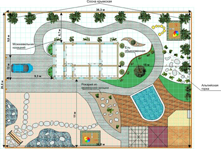 Сначала изображают основные контуры рисунка на лист бумаги, а потом участок разбивают на требуемые функциональные зоны. На этом шаге проектирования нужно все сделать так, чтобы все элементы вписывались и были пропорциональны на участке заказчика.